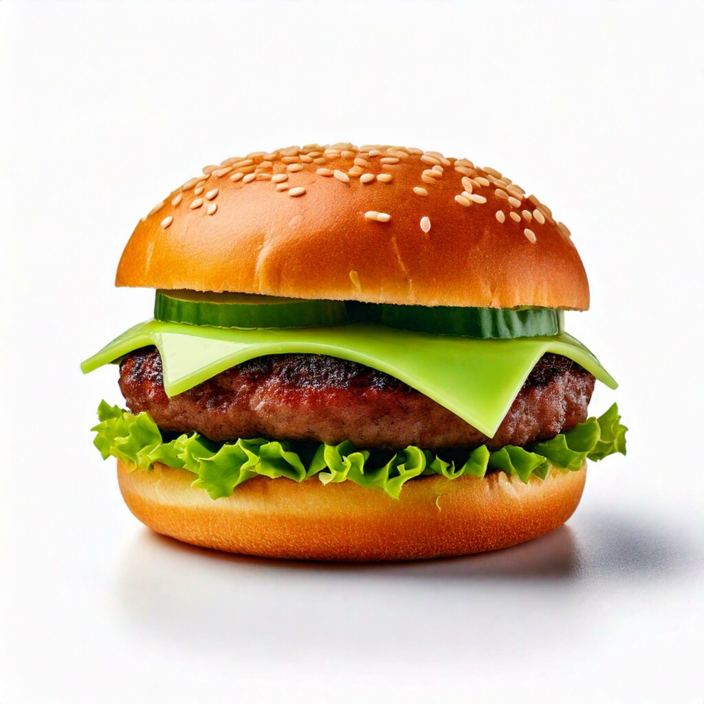 Burger. Gourmand. Couleurs vives. Fromage violet, rouge, vert.