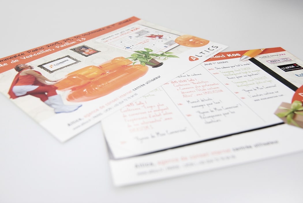 Se faire remarquer en toute originalité, telle a été notre idée de base. Grâce à la Miss Conversion, Altics a fait sensation sur le salon. Devenue immédiatement sa mascotte, ce personnage haut en couleurs et en tenue déconcertante s’est promené dans les allées pour inciter les visiteurs à se rendre sur le stand Altics. Le mobilier également présenté sur le flyer et l’e-mailing insistait sur l’identité de la société.