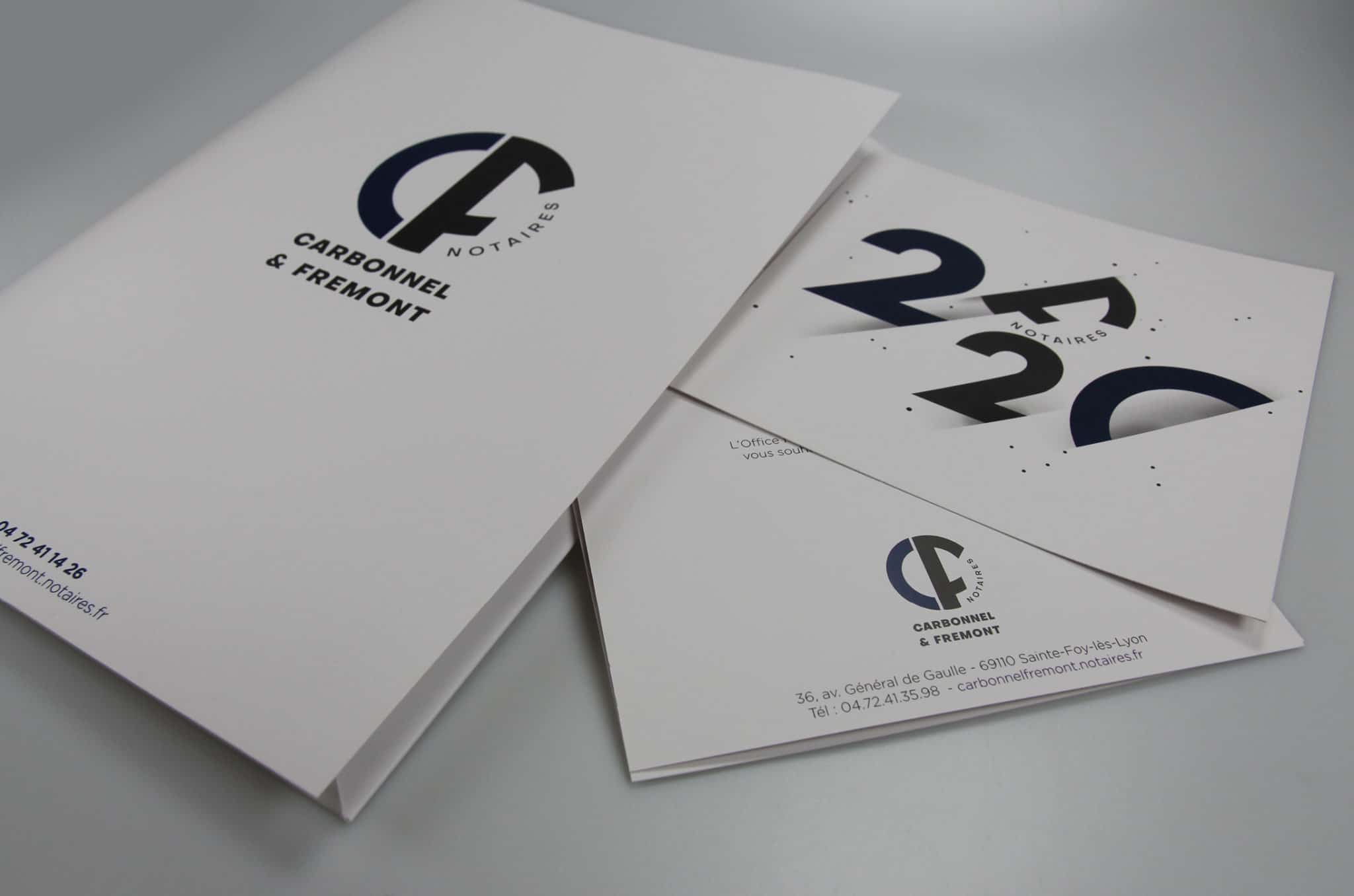 Pour l’office notarial Carbonnel et Frémont, nous avons imaginé un concept graphique épuré pour sa carte de vœux. Le logo est, ainsi, subtilement intégré à l’année 2020 qui est bien mise en avant. Nous avons également réalisé une pochette toute aussi élégante et sobre. Totalement dans l’esprit du métier de notaire !