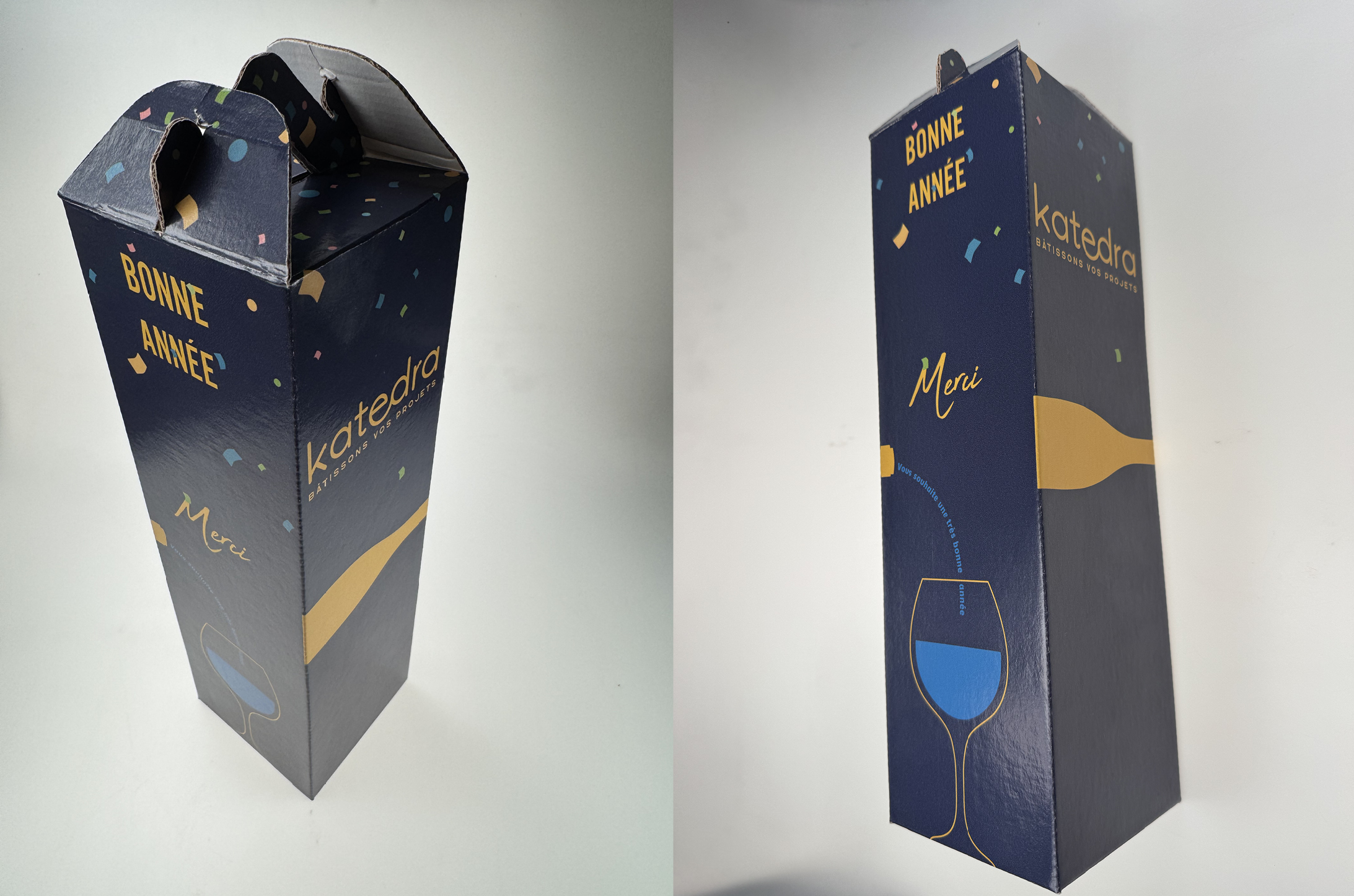 Nous avons conçu un coffret sur-mesure, décliné en deux formats (1 ou 3 bouteilles), pensé comme un véritable support de communication.