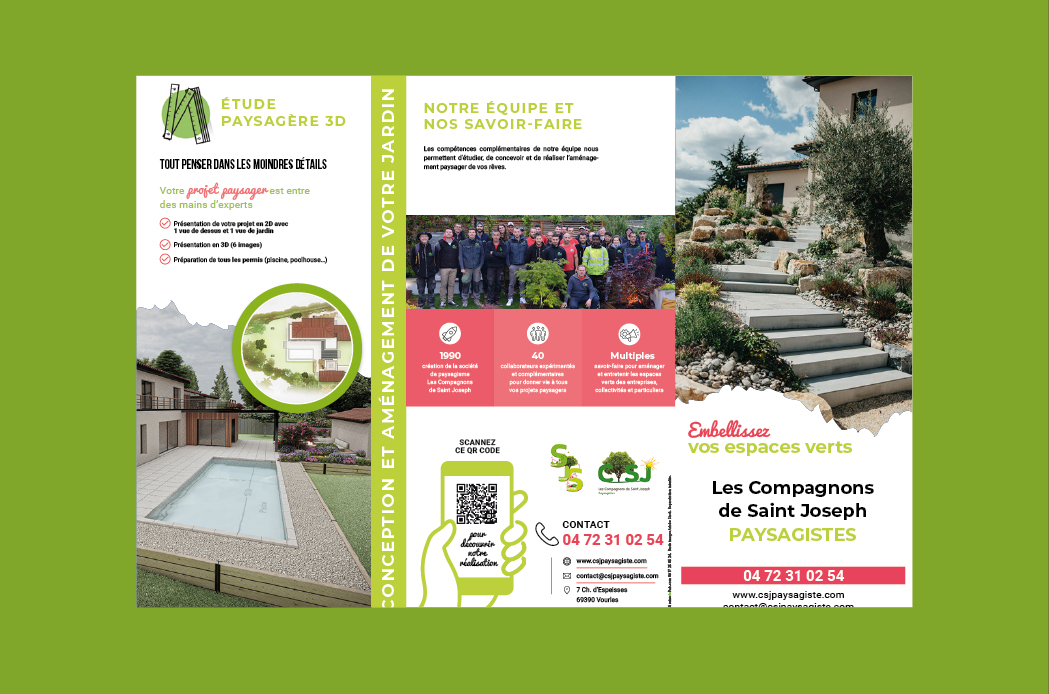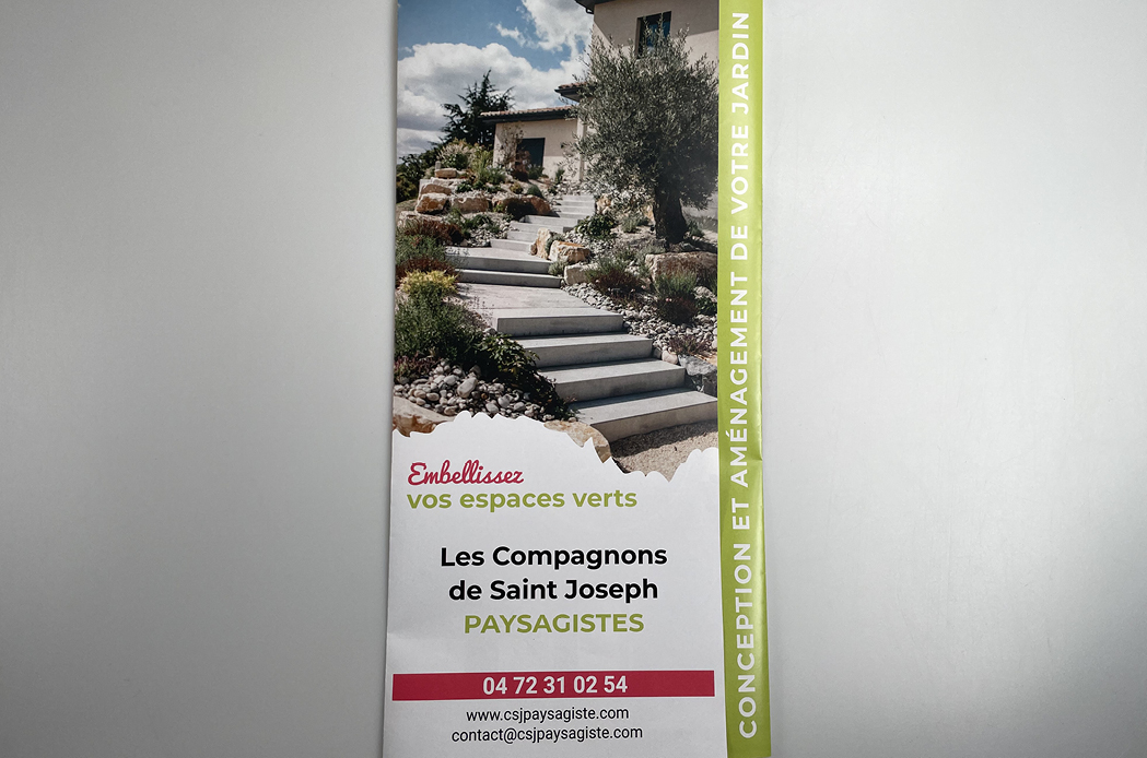 Pour cette entreprise de paysagisme, on a fait les choses en beauté pour son flyer toutes boîtes : mise en valeur de son travail par de belles photos de ses réalisations, sélection rigoureuse des arguments clés rédigés très lisiblement, avantages pour les clients bien mis en avant… Bref, le flyer est à la fois très esthétique, tout en restant accessible au plus grand nombre et c’était bien l’objectif de notre client !