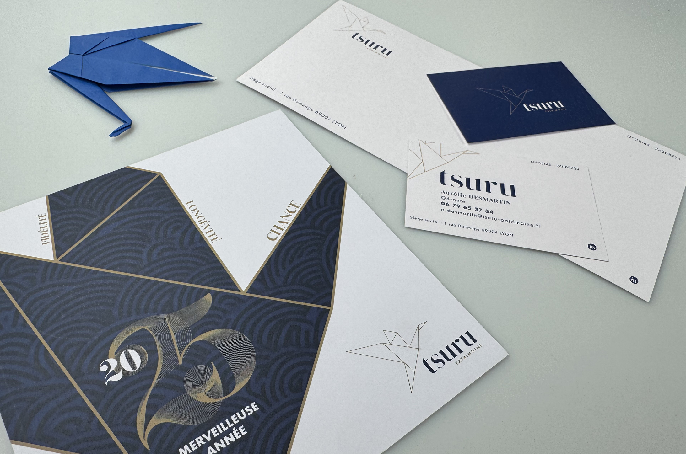 Pour Tsuru, on a bâti une vraie stratégie graphique, en se mettant à la place de ses clients : qu’attend-on d’un gestionnaire en patrimoine ? Bien évidemment, on veut qu’il fasse prendre son envol à la valeur de nos biens. Que signifie Tsuru ? C’est la grue en Japonais. Du coup, on a imaginé un oiseau façon origami pour son logo, symbolisant à la fois cette élévation et faisant le lien avec le nom de la société.