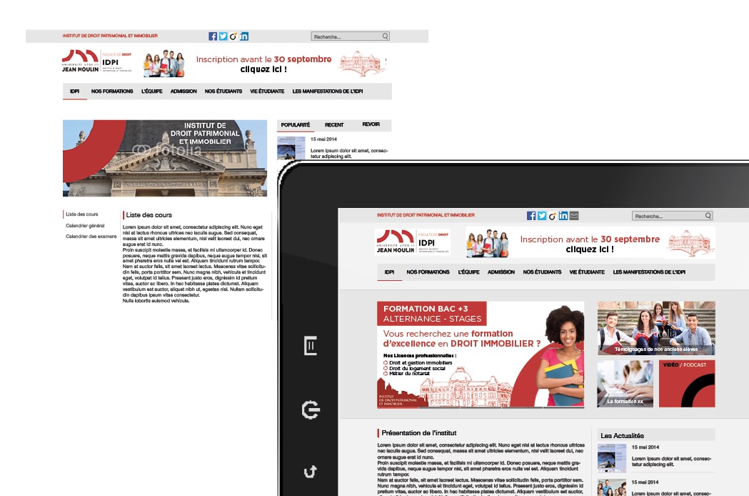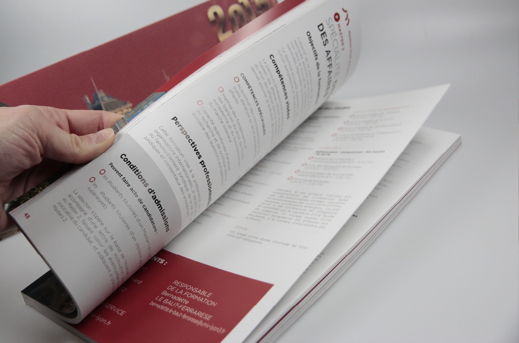 À travers ce guide des formations et le site internet dédié, nous avons voulu créer un concept graphique carré et aéré pour en faciliter la lecture à tous les étudiants. Grâce à des visuels de jeunes, nous les faisons entrer directement dans le vif du sujet. De quoi leur permettre de trouver aisément les informations qui les intéressent ! De plus, nous avons relifté le logo de la Faculté de Droit de cette université. Pour cela, nous avons opté pour des formes carrées qui faisaient bien écho à la notion de juridique. Nous avons également stylisé son bâtiment, symbole de prestige. Ensuite, nous avons réalisé l’album photos rendant hommage au doyen lors de son départ. Là, aussi, nous avons privilégié un ton graphique sobre et élégant. Pour autant, cet album reste très sympa à feuilleter !
