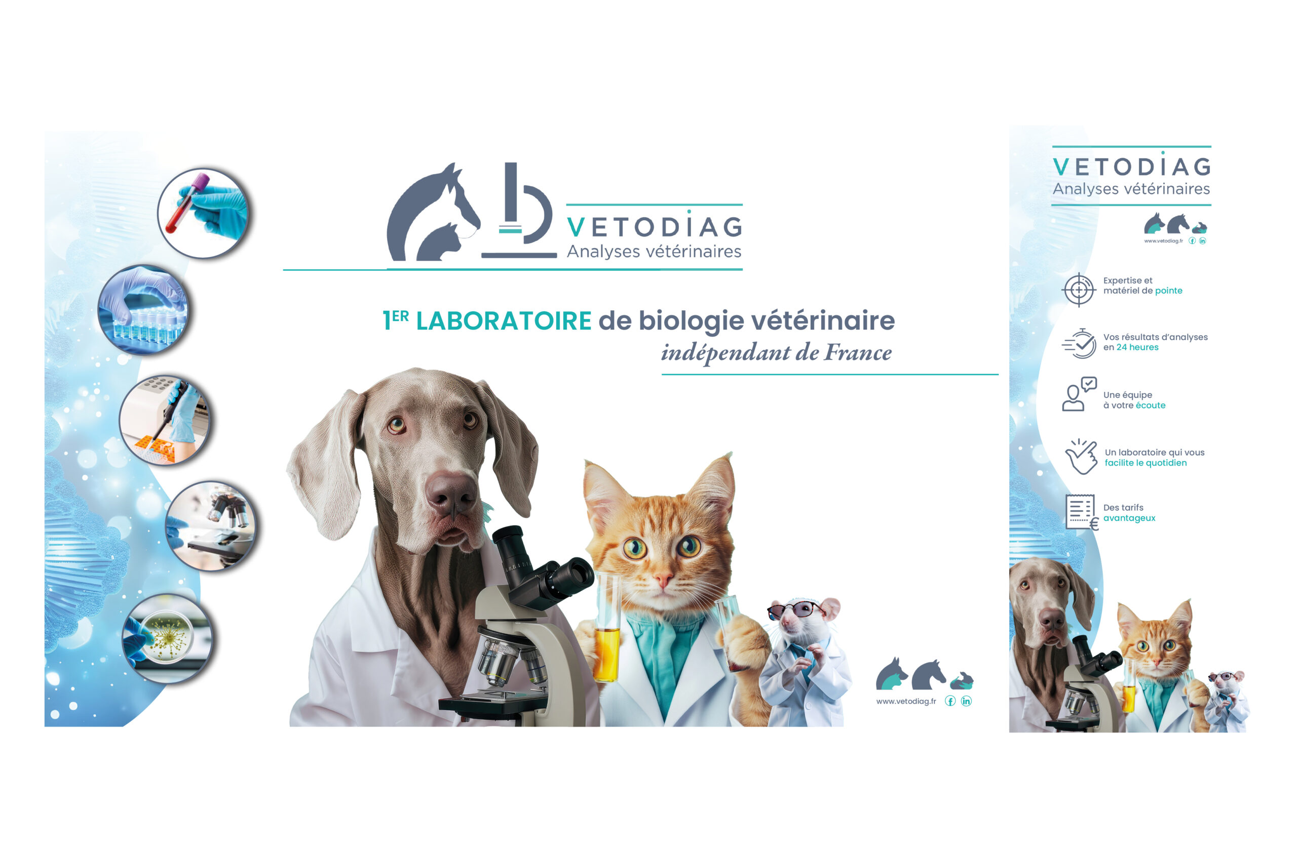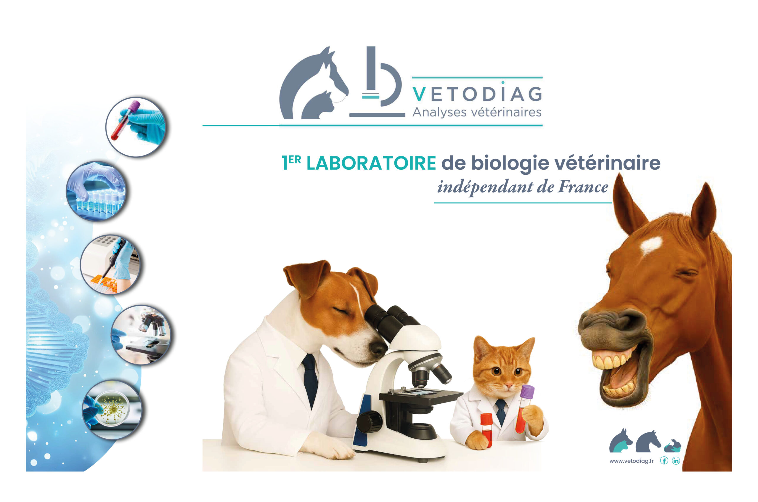 Vetodiag, laboratoire spécialisé dans les analyses vétérinaires équines, canines et félines, souhaitait un stand capable de refléter à la fois son expertise scientifique et son approche accessible et humaine.